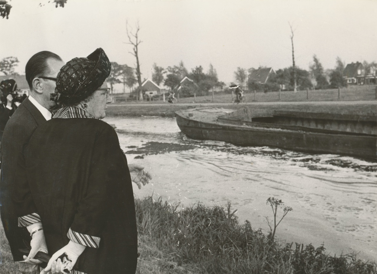 (foto: Koningin Juliana bekijkt het vervuilde Pekelder Hoofddiep)
